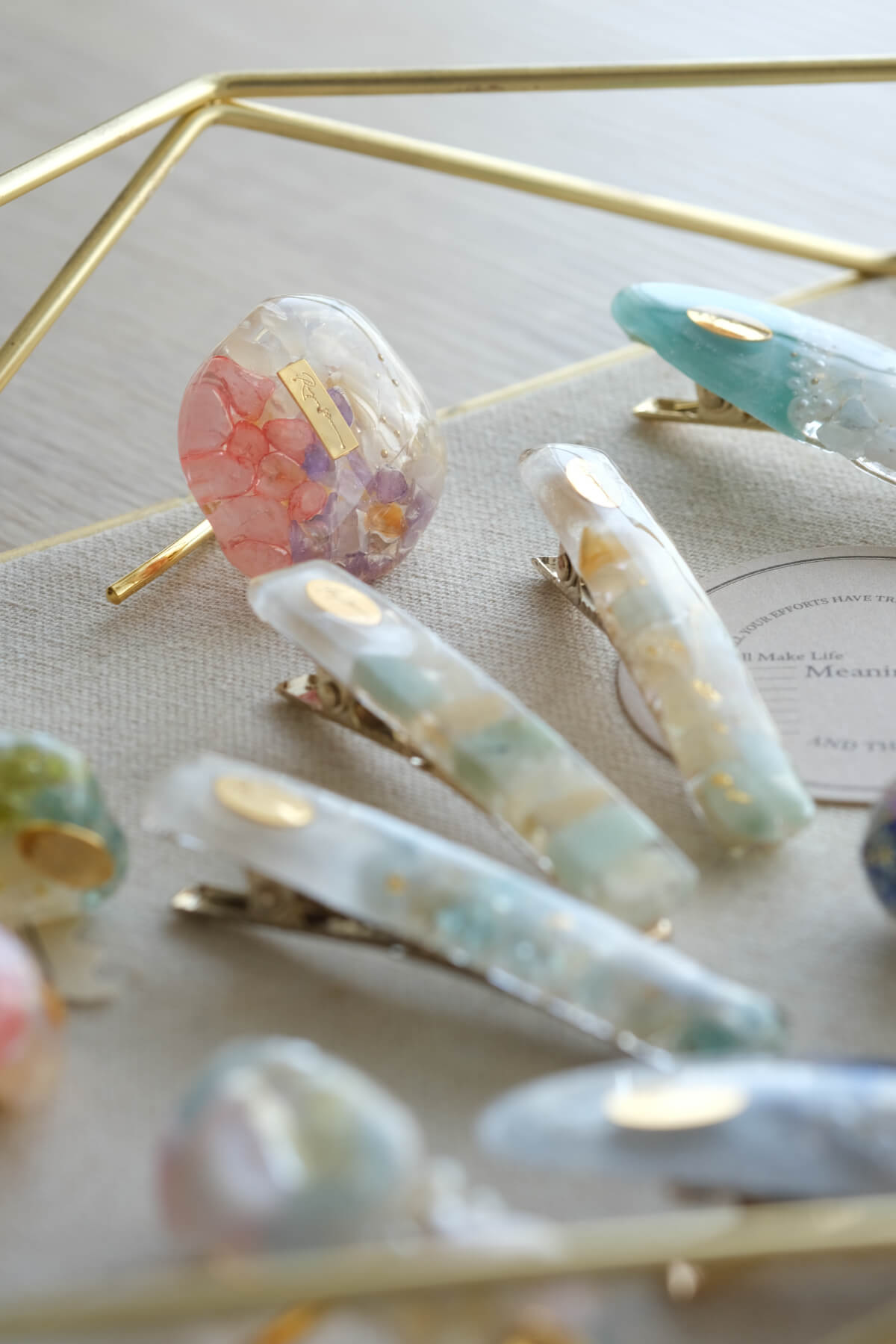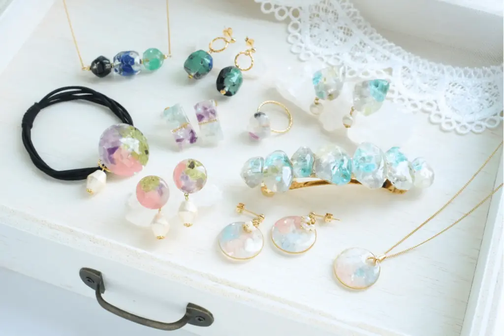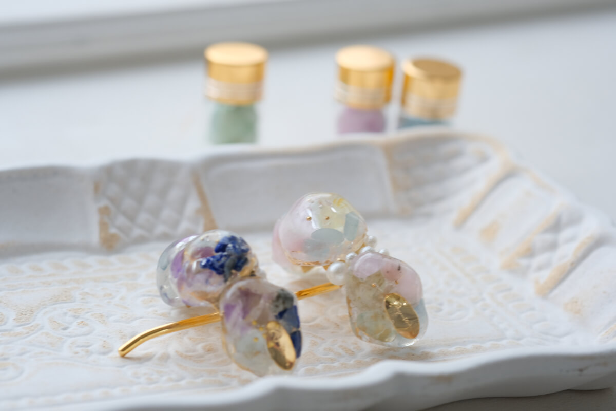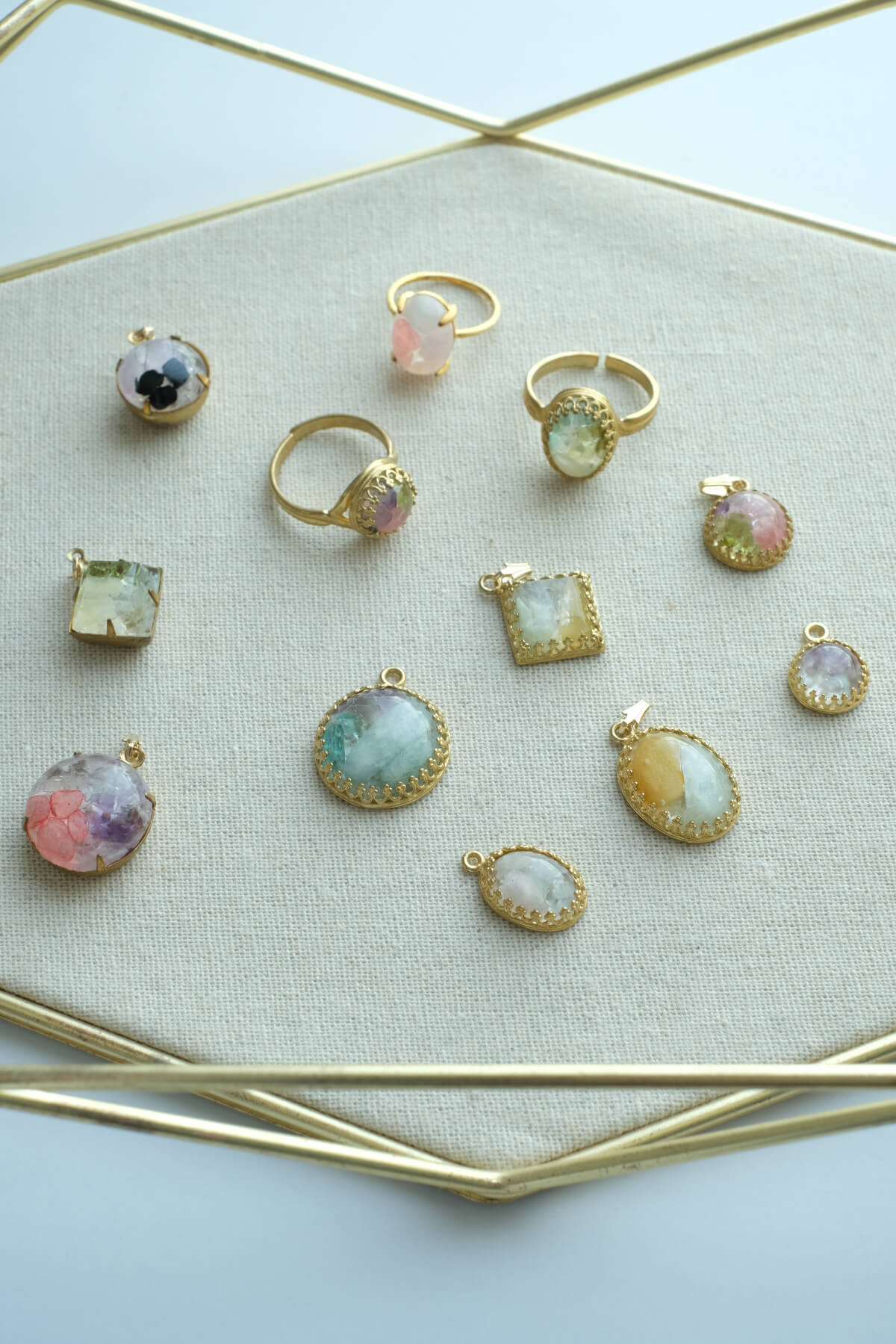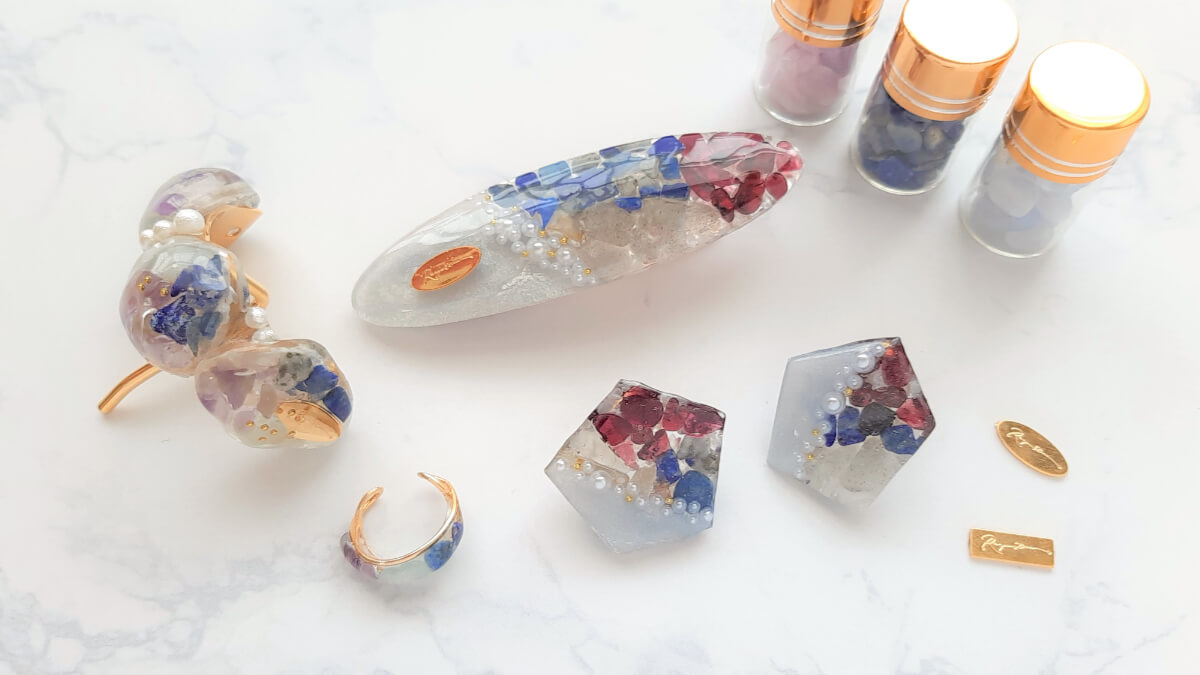 天然石をレジンで加工することで、耳飾りやネックレスはもちろん、ヘアアクセサリーやリングなど、色々なアイテムを作ることが可能です。