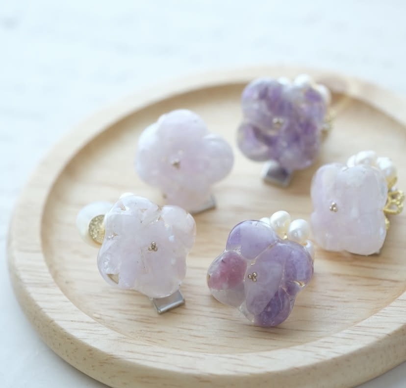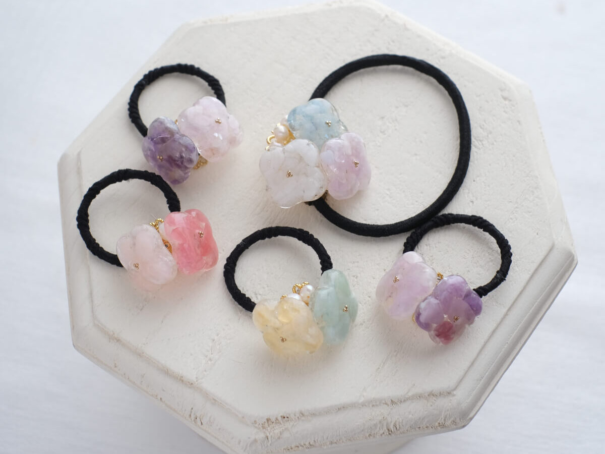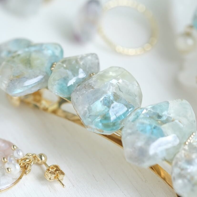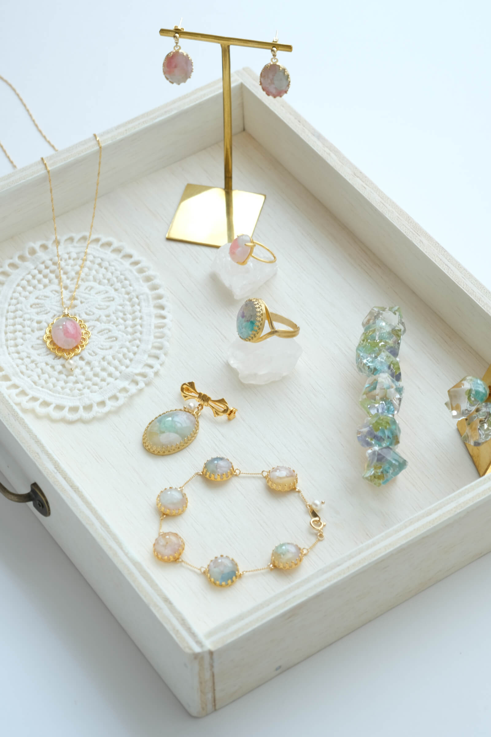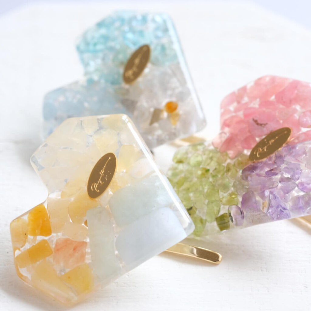 天然石をレジンで加工することで、耳飾りやネックレスはもちろん、ヘアアクセサリーやリングなど、色々なアイテムを作ることが可能です。