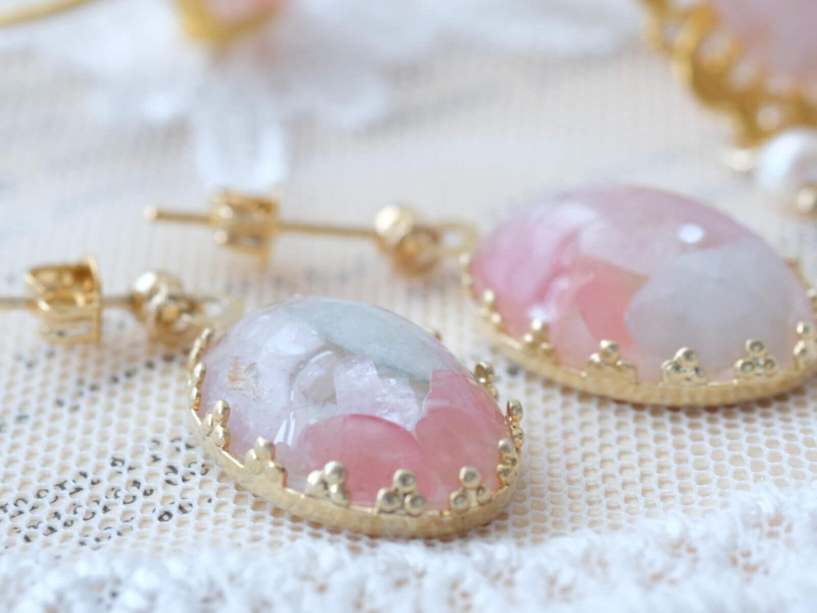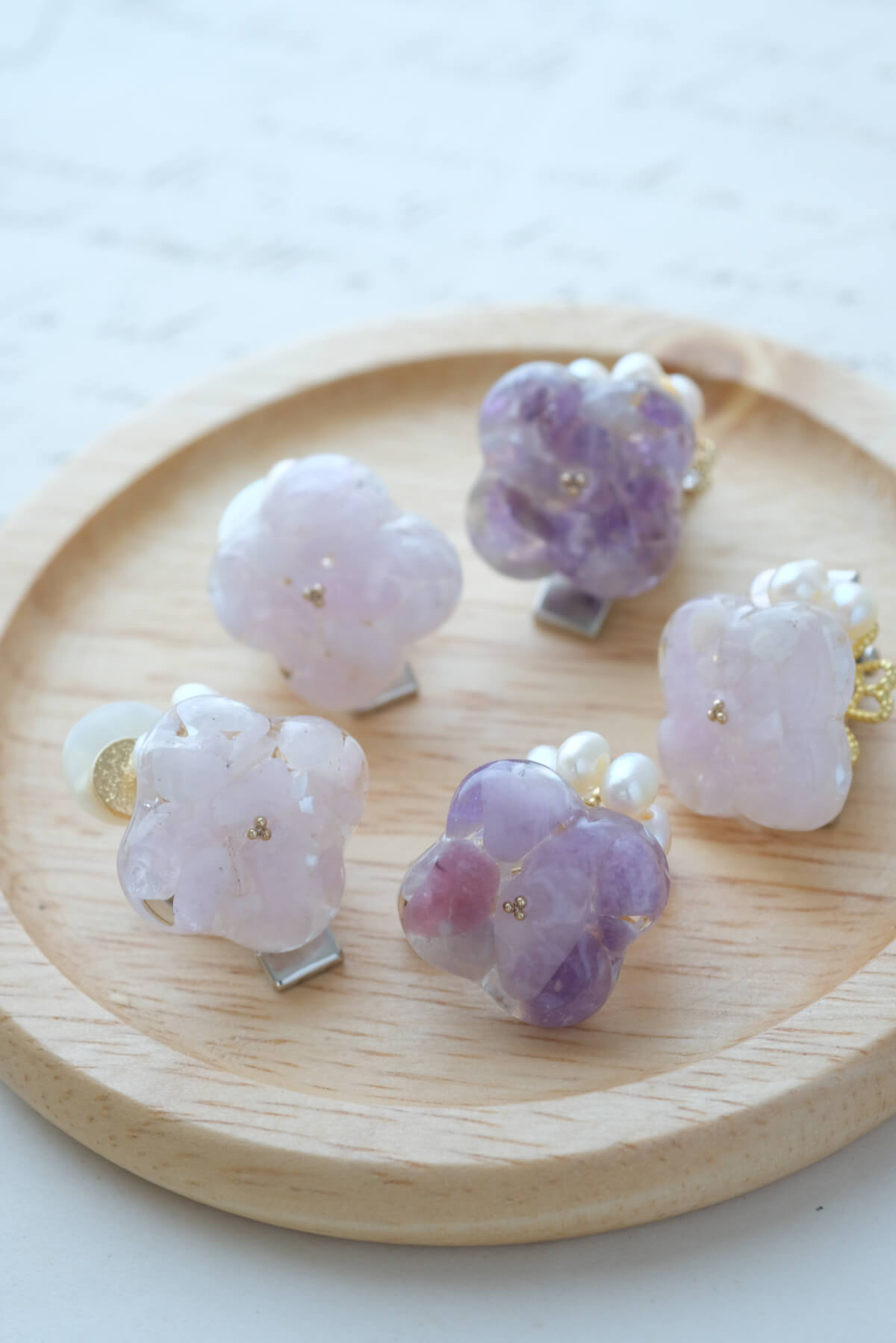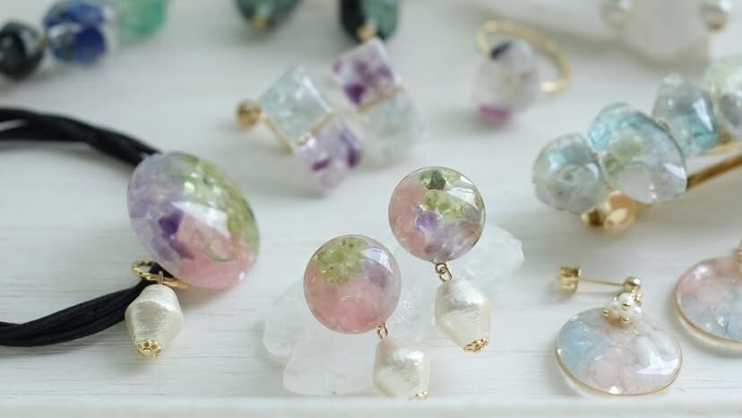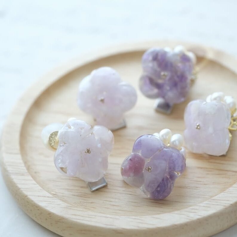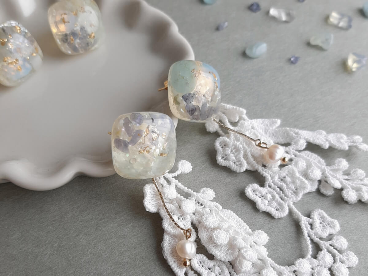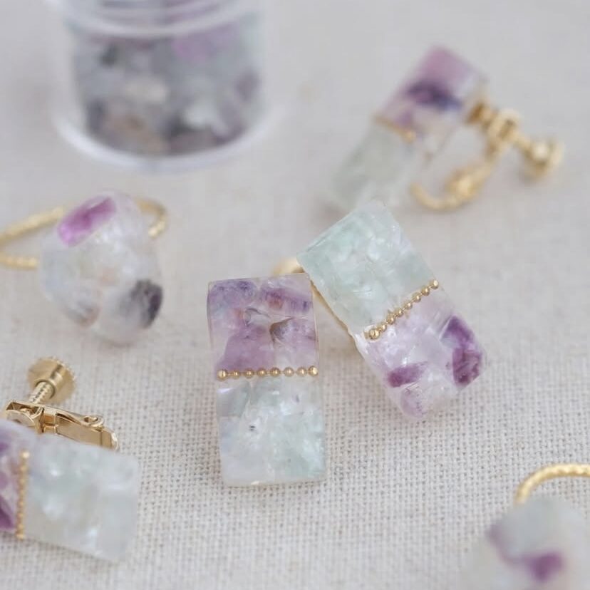 天然石をレジンで加工することで、耳飾りやネックレスはもちろん、ヘアアクセサリーやリングなど、色々なアイテムを作ることが可能です。
