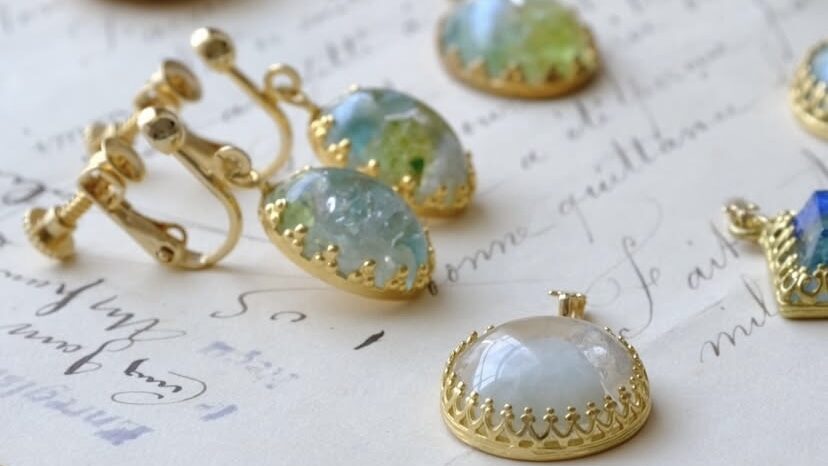 レジンと天然石を組み合わせたオリジナルパーツの美しい作り方や、アクセサリーとして丁寧に仕上げる方法をオンラインで学びます。