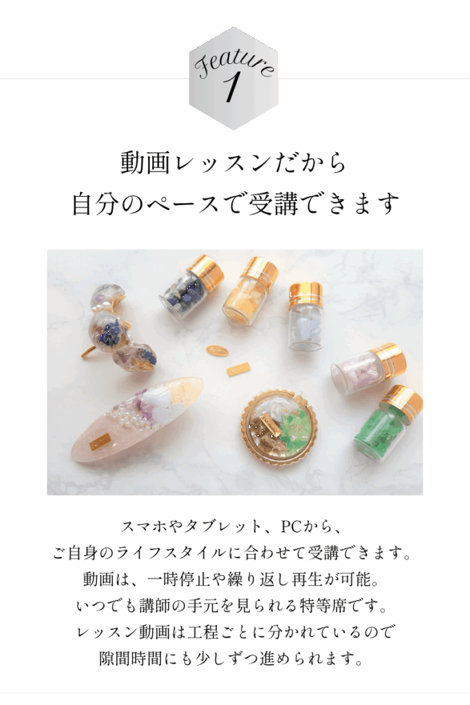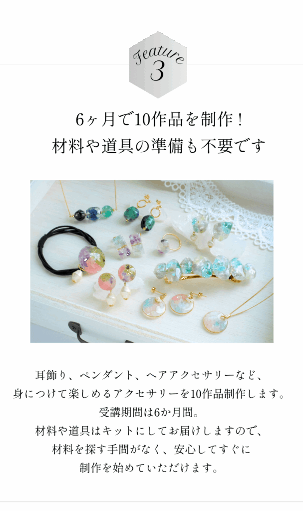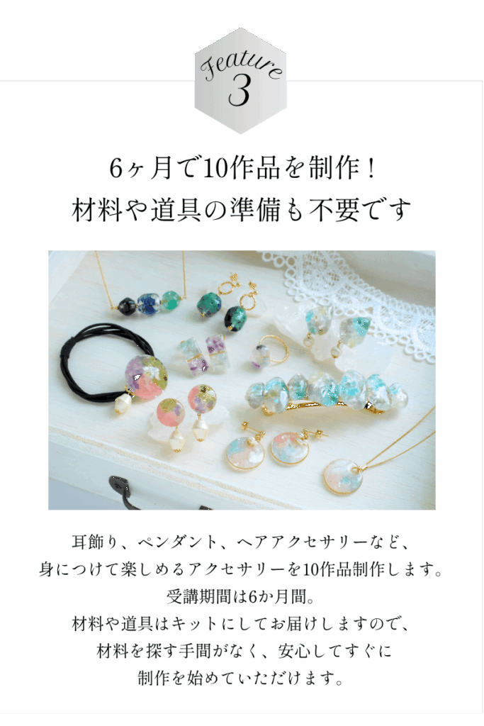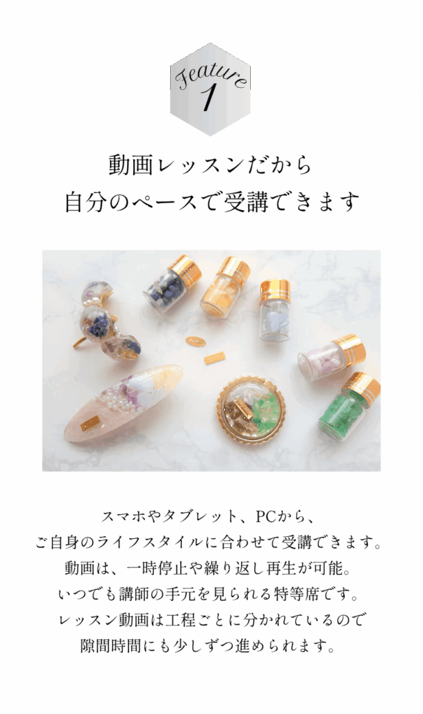 かわいいデザインのアクセサリーが次々と仕上がっていくのが楽しかったです。レジンを扱う時の気をつけなければならない事や、天然石を入れる時のポイントなどを丁寧に動画で受講できたのがよかったです !(何度も見返せるので)