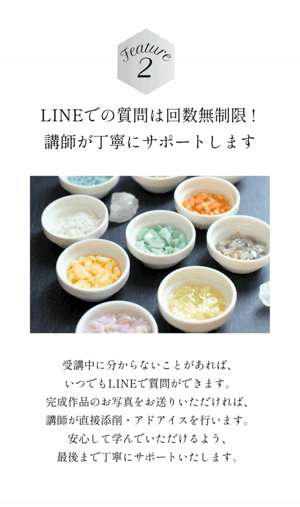 天然石を見ているだけでときめくのと、自分が作った作品をプレゼント用に購入してくださりとても嬉しいです。ただかわいい作品が作れるだけじゃない根拠のある説明が魅力的だと思うので安心して受講できます。