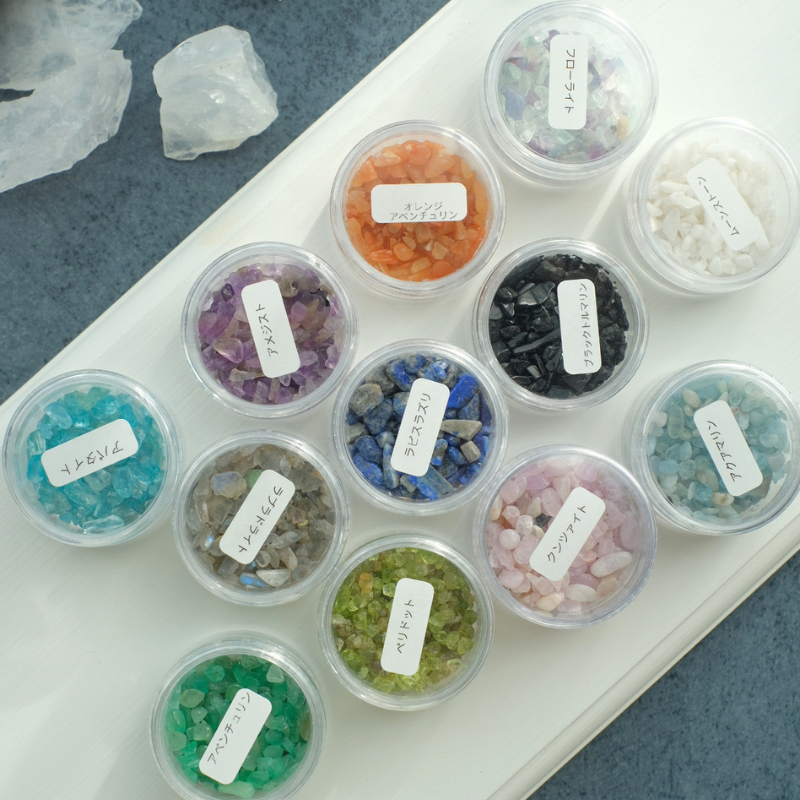 鉱物のカケラ「さざれ石」をレジンの中に詰め込んで、耳かざりを作ります。