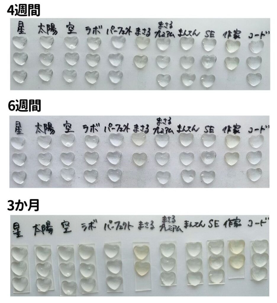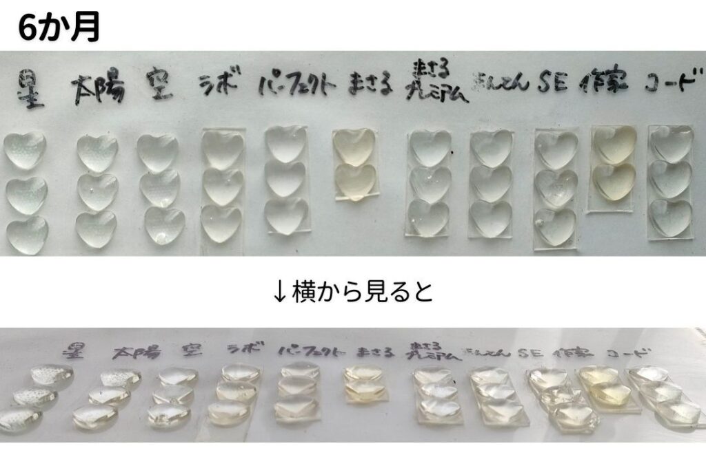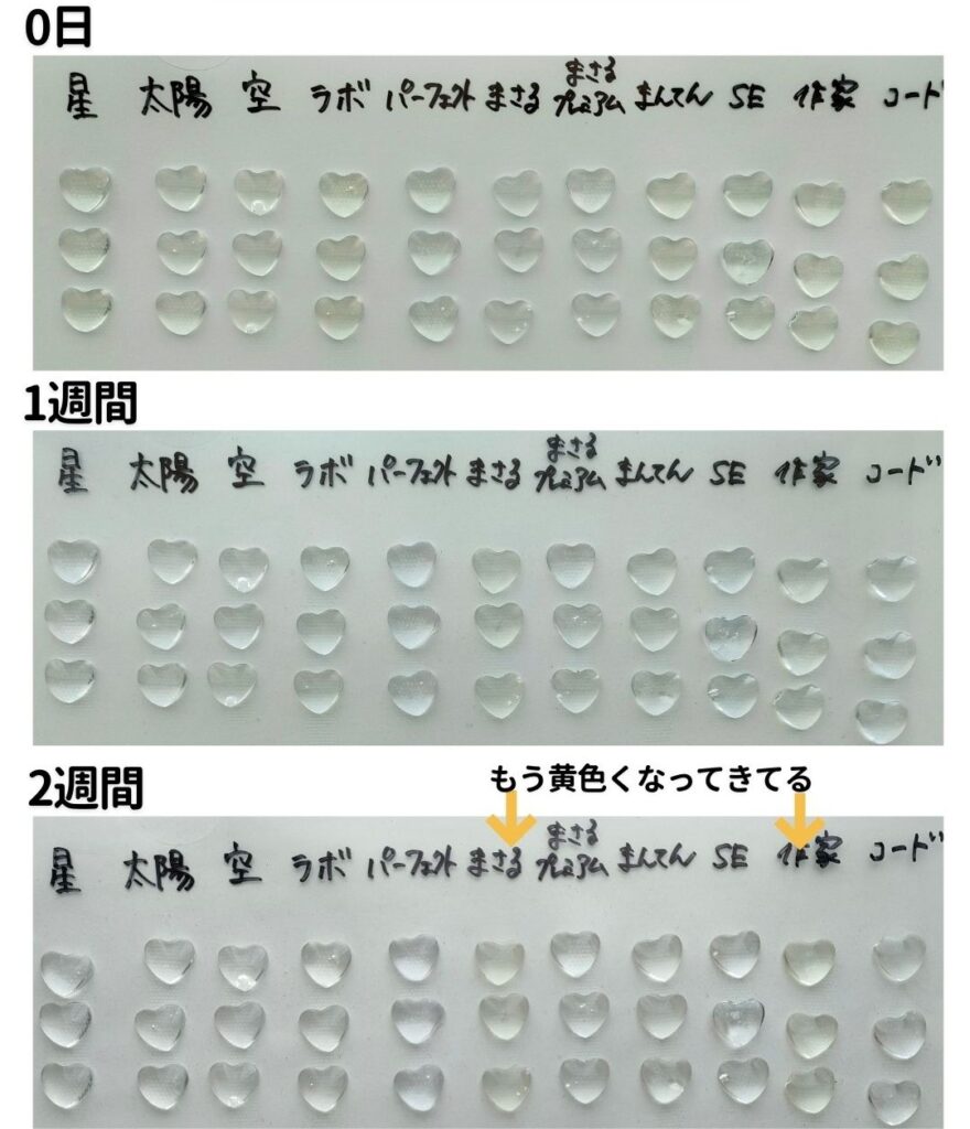 | レジン液名 | 2週間後の状態 | 6ヶ月後の状態 |
